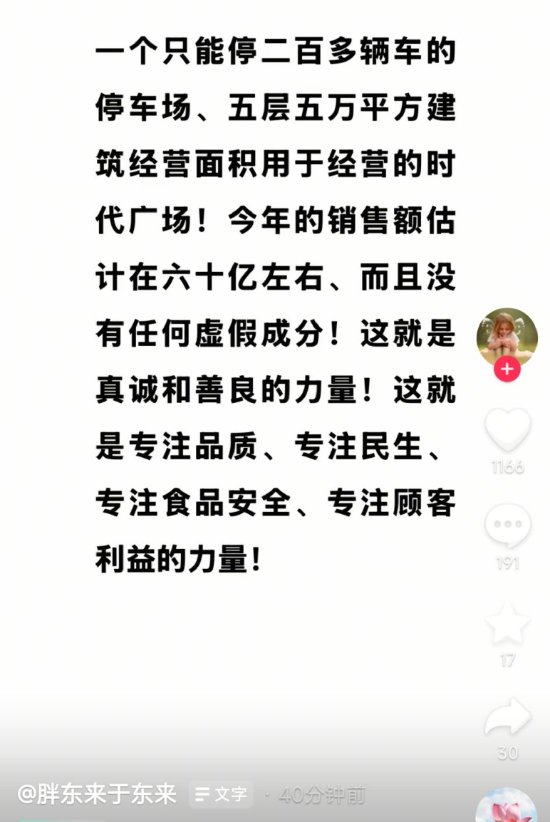 同时,于东来还透露,胖东来今年的销售额估计在六十亿左右,“这就是真诚和善良的力量!这就是专注品质、专注民生、专注食品安全、专注顾客利益的力量!”